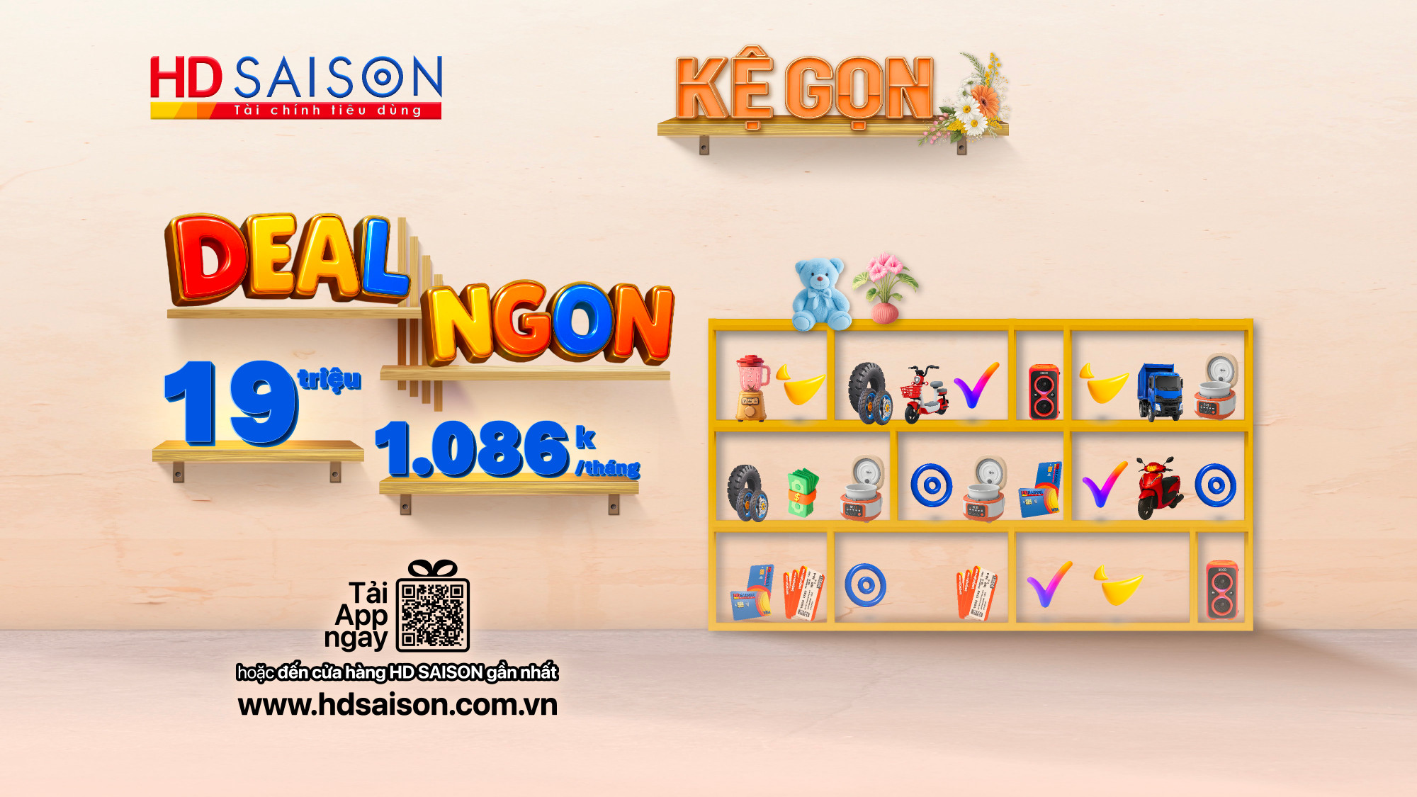 Giờ đây, những kế hoạch mua sắm, nâng cấp nhà cửa hay chuẩn bị cho chuyến du lịch cuối năm đều trở nên dễ dàng hơn với gói vay lãi suất chỉ 29,4%/năm. Đặc biệt, khi tham gia "Kệ gọn, deal ngon" trên App HD SAISON, bạn sẽ có cơ hội nhận lãi suất chỉ 18,4%/năm cho khoản vay đến 19 triệu đồng, trả góp nhẹ nhàng chỉ từ 1.086k/tháng.