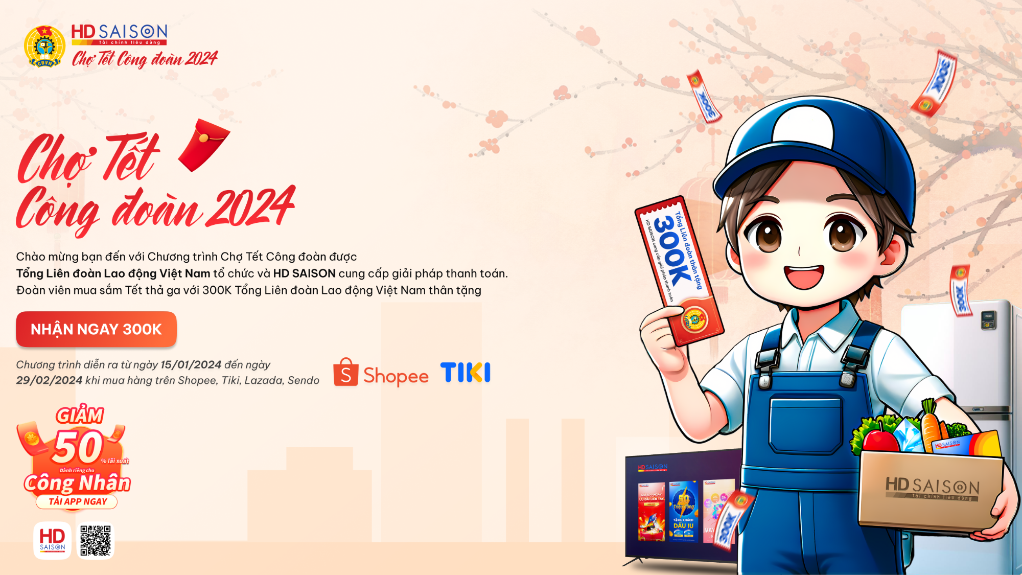 Nhằm góp phần mang đến Tết đầm ấm, đủ đầy cho đoàn viên, người lao động và gia đình trong dịp Tết đến, Xuân về, chương trình Chợ Tết Công đoàn 2024 do Tổng Liên đoàn Lao động Việt Nam tổ chức sẽ chính thức bắt đầu từ 00h ngày 15/01/2025 dưới hình thức mua sắm trực tuyến bằng thẻ tín dụng HD SAISON.