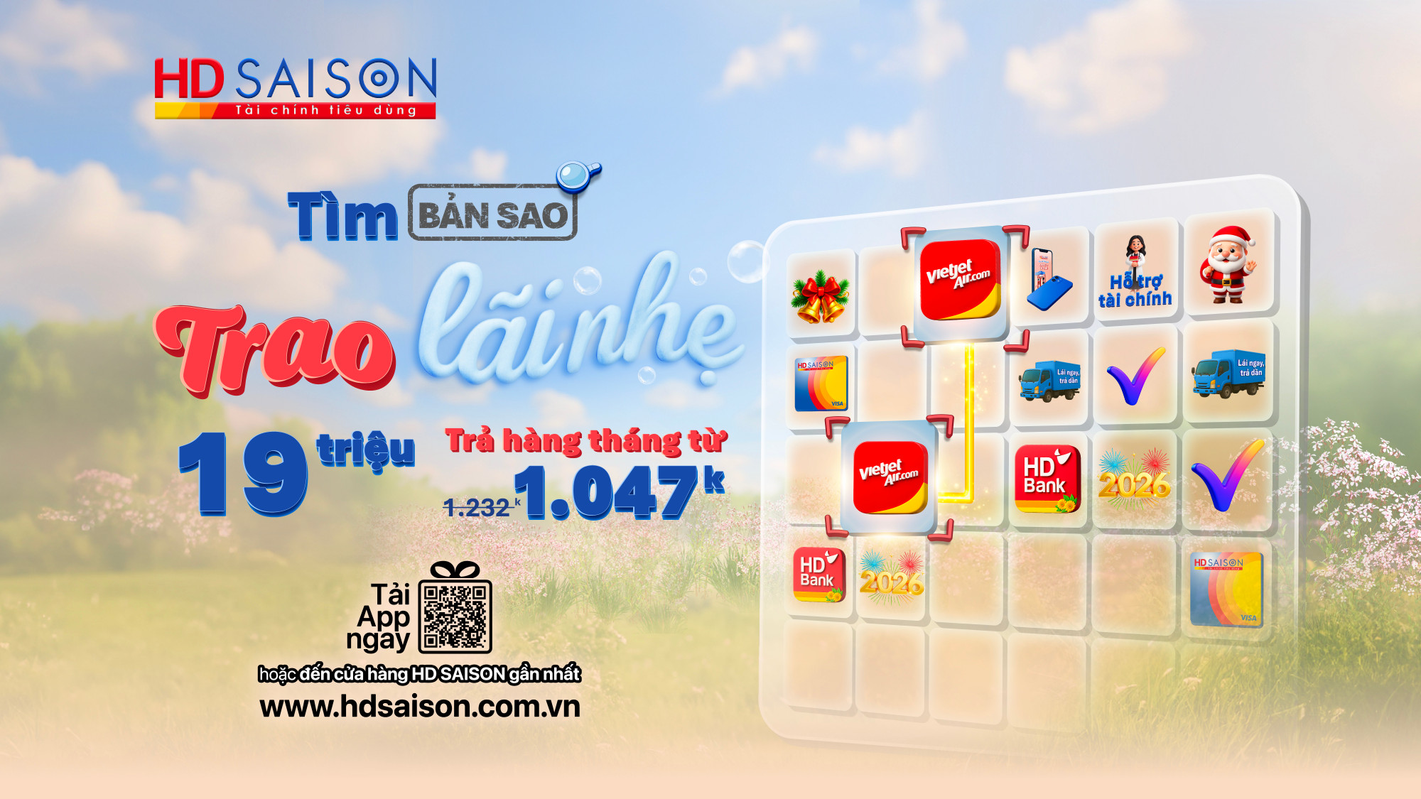 Chương trình “Tìm bản sao, trao lãi nhẹ” của HD SAISON mang đến cho Quý khách hàng cơ hội vay đến 19 triệu. Với mức lãi suất nhẹ nhàng giúp khách hàng tự tin thực hiện mọi kế hoạch chi tiêu cuối năm và tận hưởng một mùa Giáng sinh ấm áp.