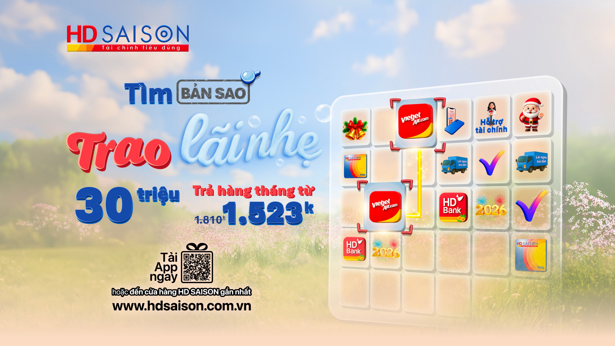 Chương trình “Tìm bản sao, trao lãi nhẹ” của HD SAISON đã quay trở lại với cơ hội vay đến 30 triệu. Lãi suất nhẹ nhàng giúp khách hàng tự tin thực hiện mọi kế hoạch chi tiêu cuối năm và tận hưởng một mùa Giáng sinh ấm áp.