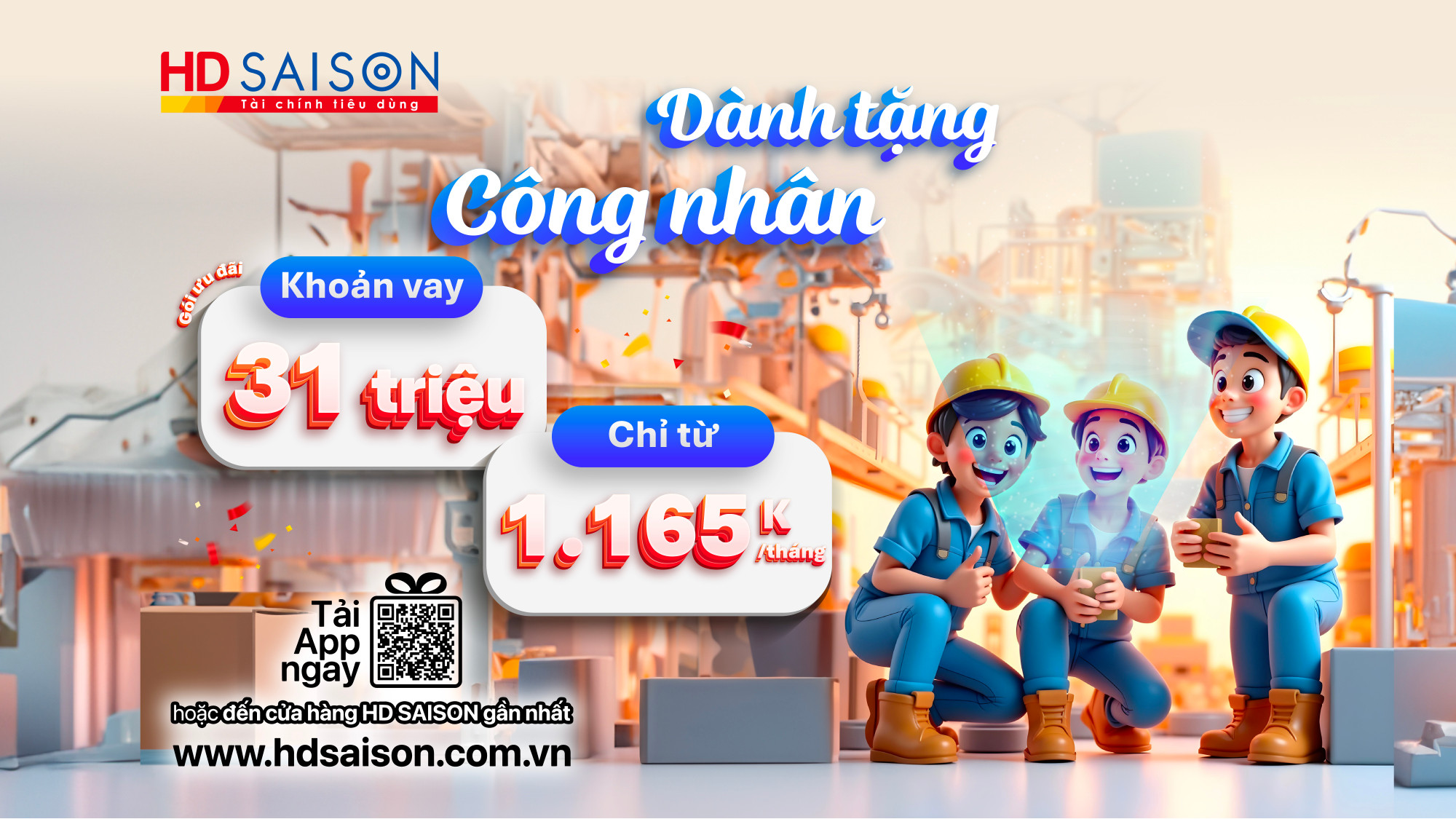 Tiếp nối sự thành công từ những chương trình đặc biệt và thiết thực được thiết kế dành riêng cho Đoàn viên, Công nhân từ gói tín dụng 15.000 tỷ phi lợi nhuận, HD SAISON tự tin mang đến sự an tâm và trọn vẹn hơn cho người lao động, Đoàn viên, Công nhân thông qua giải pháp tài chính ổn định xuyên suốt trong năm 2025. Khoản vay không chỉ giúp bạn chủ động hơn trong chi tiêu, mua sắm hay lo cho con học hành, mà còn là cách để HD SAISON gửi lời tri ân, tôn vinh giá trị lao động chân chính – những con người âm thầm tạo nên sức sống cho nền kinh tế: