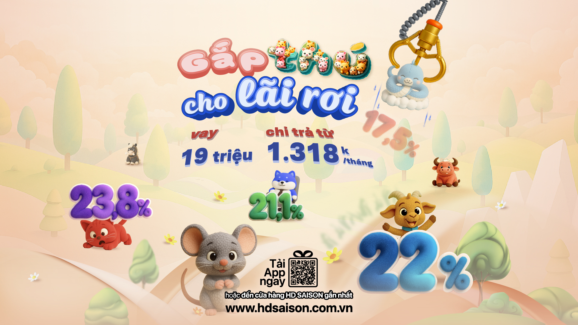 Thông qua chương trình “Gắp thú cho lãi rơi” trên App HD SAISON, khách hàng có cơ hội “săn” ưu đãi vay đến 19 triệu đồng với mức lãi suất chỉ 16,6%/năm – nghĩa là mỗi tháng chỉ cần góp nhẹ từ 1.318k.