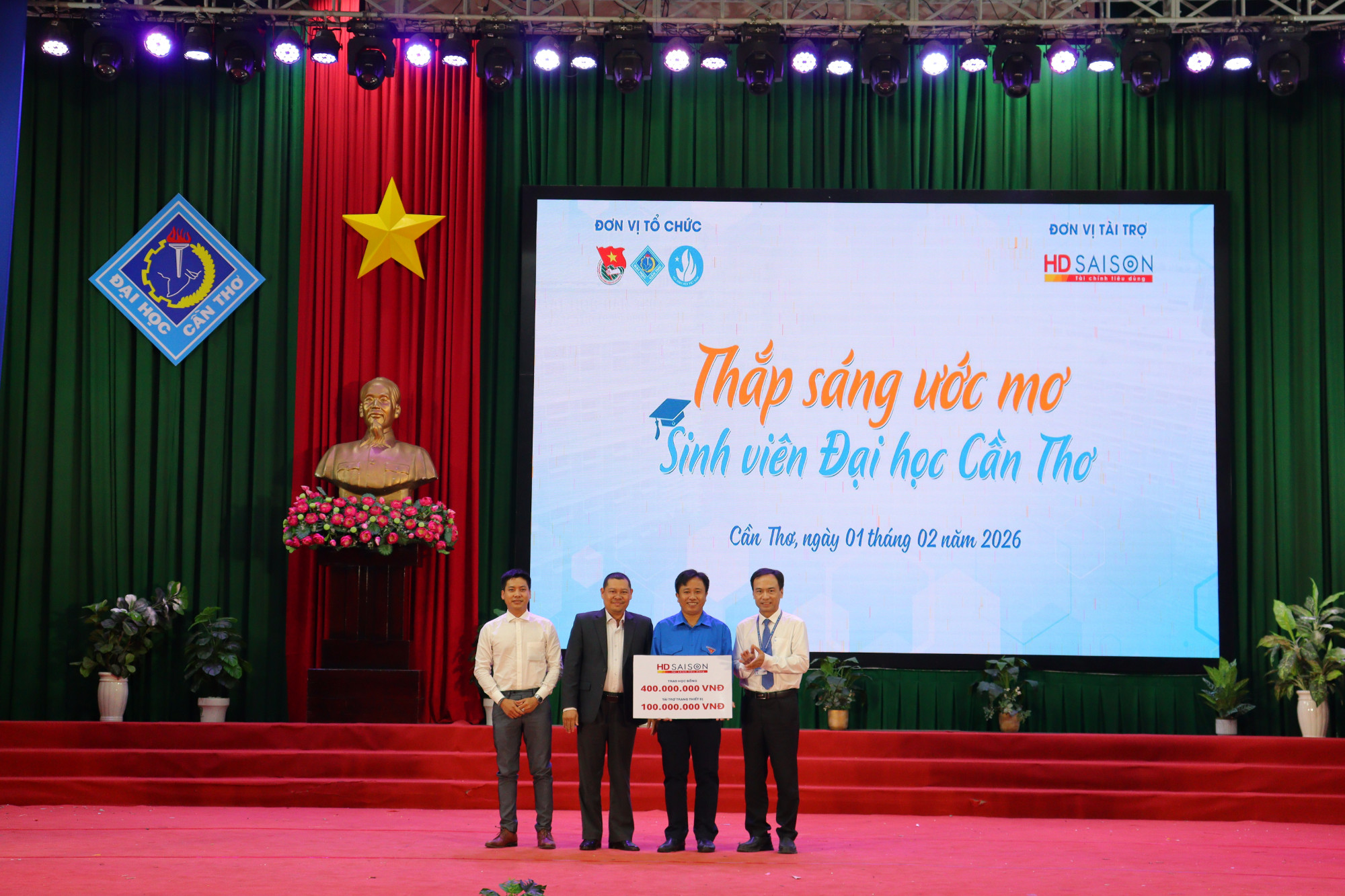 Trong không khí rộn ràng những ngày đầu Xuân mới, khi Tết đang gõ cửa, ngày 01/02/2026, HD SAISON phối hợp cùng Ban Thường vụ Đoàn Đại học Cần Thơ tổ chức chương trình “Thắp sáng ước mơ sinh viên Đại học Cần Thơ” năm học 2025 - 2026, trao 100 suất học bổng cho sinh viên có hoàn cảnh khó khăn, học tập tốt, với tổng trị giá 500 triệu đồng.