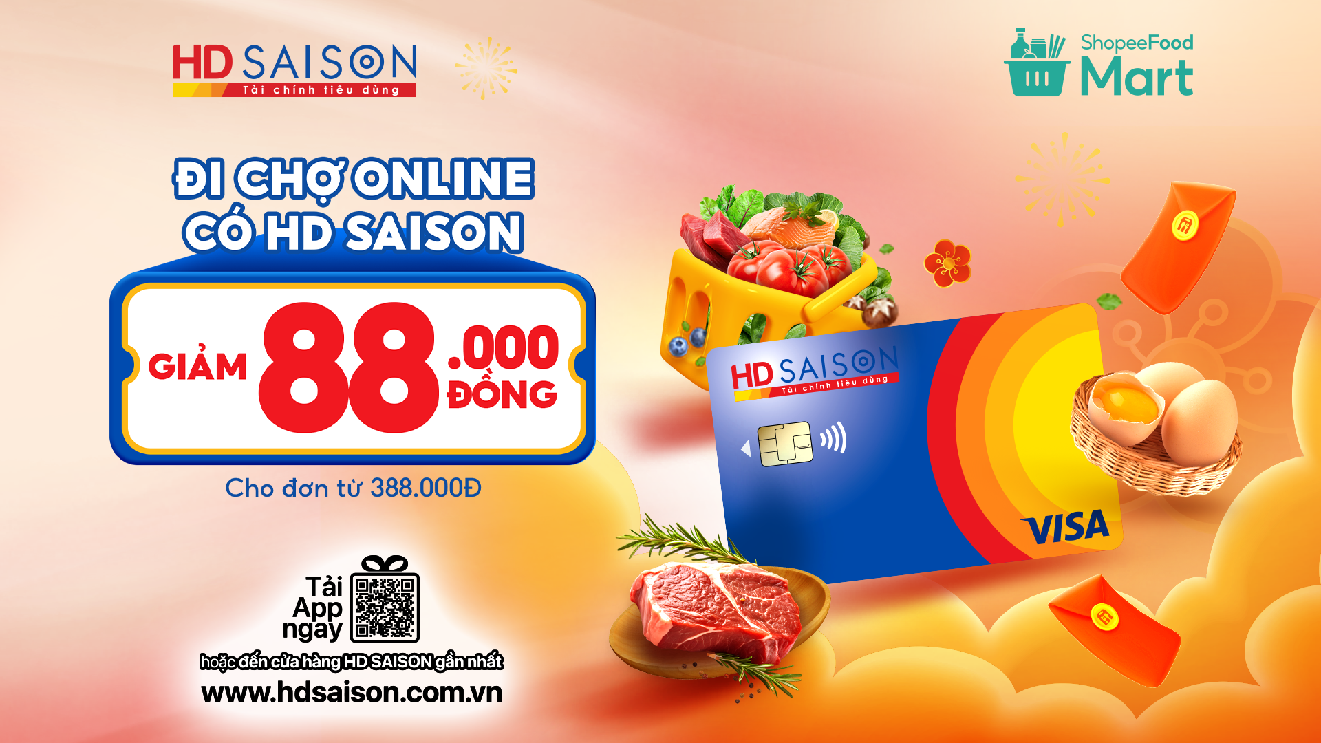 Dù là phong vị Châu Á truyền thống, tiệc Châu Âu sang trọng hay thực đơn chay thanh đạm, thẻ HD SAISON giúp bạn chủ động ngân sách đi chợ cho mọi bữa tiệc tân niên. Chỉ cần lựa chọn thực phẩm tươi ngon, chính hãng tại ShopeeFood Mart, tất cả sẽ sẵn sàng lên mâm trong tích tắc. Có HD SAISON đồng hành, để mỗi khoảnh khắc sum vầy đều trở nên thật thảnh thơi và trọn vẹn.