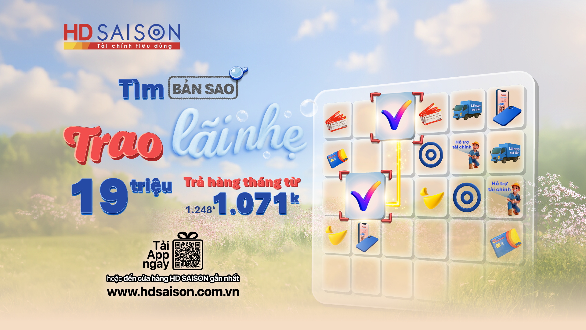 Chương trình “Tìm bản sao, trao lãi nhẹ” của HD SAISON mang đến cho Quý khách hàng cơ hội vay đến 19 triệu. Với mức lãi suất nhẹ nhàng giúp khách hàng tự tin thực hiện mọi kế hoạch chi tiêu cuối năm và tận hưởng một mùa Giáng sinh ấm áp.