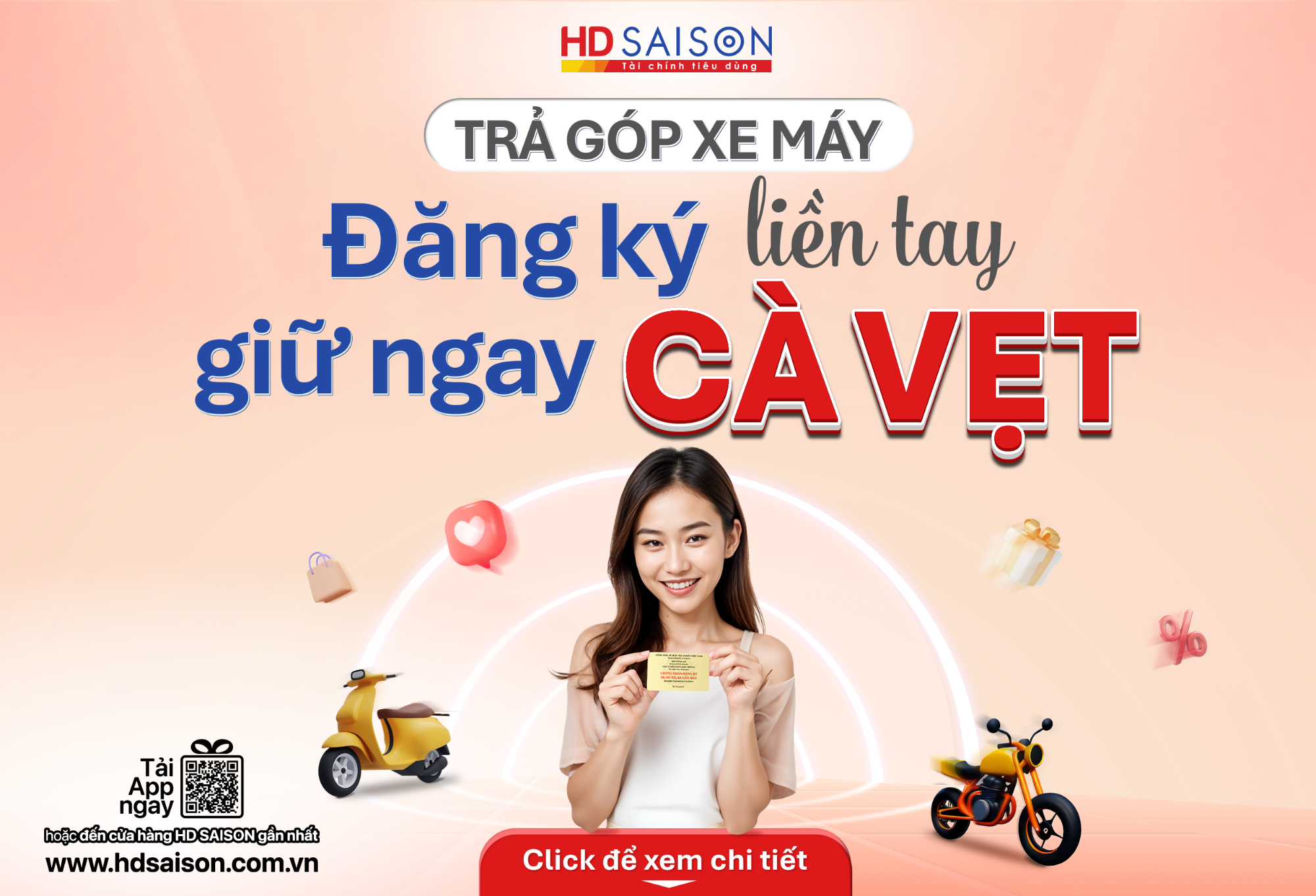 Vừa giúp bạn có thể dễ dàng sở hữu ngay chiếc “xế cưng” yêu thích bằng giải pháp tài chính linh hoạt, chương trình Trả góp xe máy – Đăng ký liền tay tại các điểm giới thiệu dịch vụ mà HD SAISON liên kết còn giúp bạn nhận ngay cà vẹt gốc đem về khi đăng ký vay trả góp các dòng xe máy đa dạng (*).