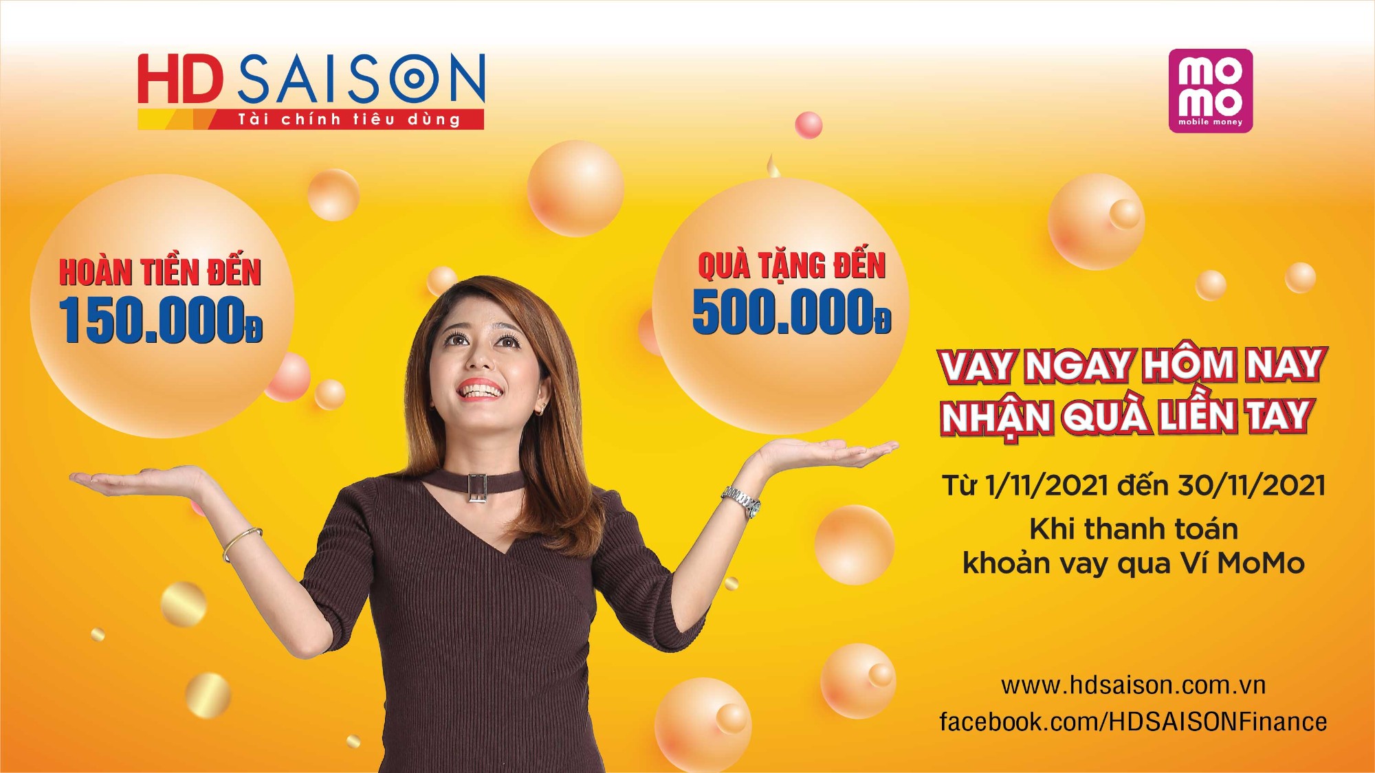 Từ ngay hôm nay, khách hàng vay với HD SAISON và thanh toán khoản vay qua ví Momo sẽ nhận hoàn tiền đến 150.000đ và được nhận thêm gói quà trị giá 500.000đ gồm nhiều thẻ quà thanh toán hóa đơn, nạp tiền điện thoại, mua bảo hiểm,.. Cụ thể như sau: